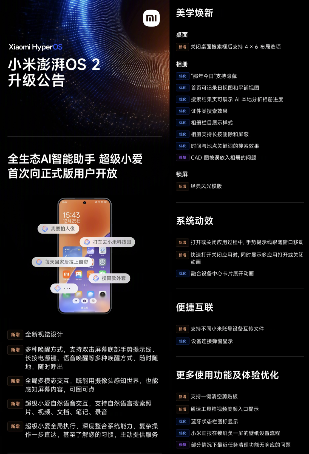 如上图所见,除了超级小爱正式版首次面向正式版用户开放外,澎湃OS2也新增多项实用功能和体验优化,特别是相册进行了多个细节调整。