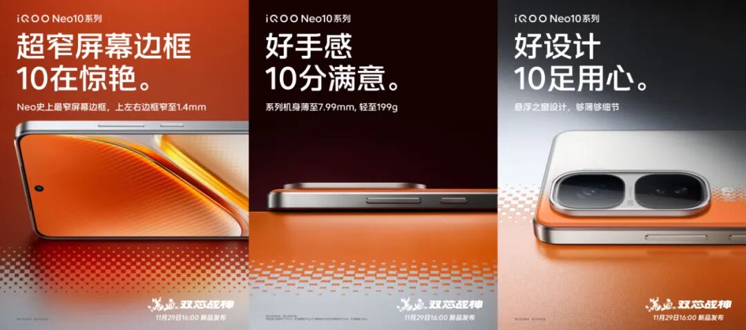 如上图所见,iQOO Neo10系列官宣将于11月29日16点发布,提供疾影黑、拉力橙、驰光白3个颜色,具体这次分为Neo10和Neo10 Pro两款型号,Neo10 Pro搭载天玑9400和自研电竞芯片Q2(Neo10标准版网传搭载骁龙8 Gen3)