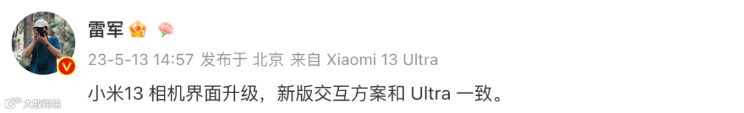 小米手机官方微博表示:“小米13、小米 13 Pro相机新增「变焦转盘」,小米 13 Ultra 同款,让调焦更方便,带来更专业的操作体验。”