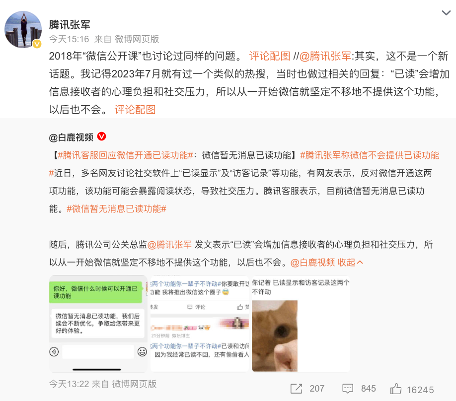 如上图所见,腾讯公司公关总监张军表示这个话题之前就讨论过,2018年微信公开课曾表示希望更多人在微信里感受到没有负担的用户体验,所以微信没有已读功能;2023年7月相关话题也登上热搜,当时也回应过「腾讯认为“已读”会增加接收者的心理负担和社交压力,所以从一开始微信就坚定不移地不显示这个功能,以后也不会。」