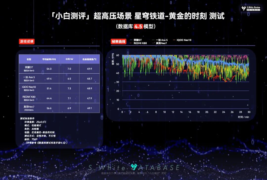 30分钟超高压场景《星穹铁道-黄金的时刻》实测:整体表现上5款手机都有出现掉帧,平均帧率最高的真我Neo7(56.6FPS),其次是荣耀GT(54FPS),5款机型功耗都在6.5W及以上,机身最高温度均在47℃以上。