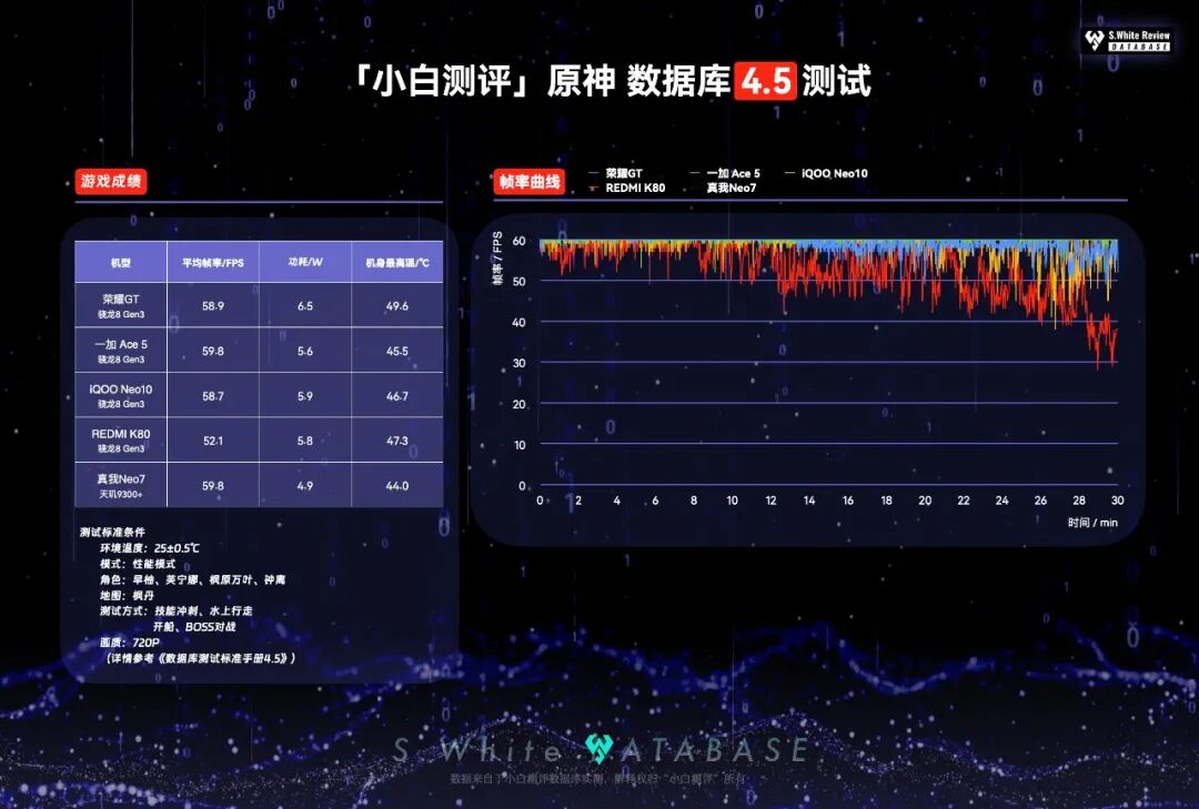 30分钟《原神》数据库4.5模型实测:一加和真我表现突出,平均帧率都为59.8FPS,功耗除真我4.9W外,其它几款都在5.6W及以上,Neo7机身最高温为44℃,另外四款则在45℃以上,详细数据参考上图。