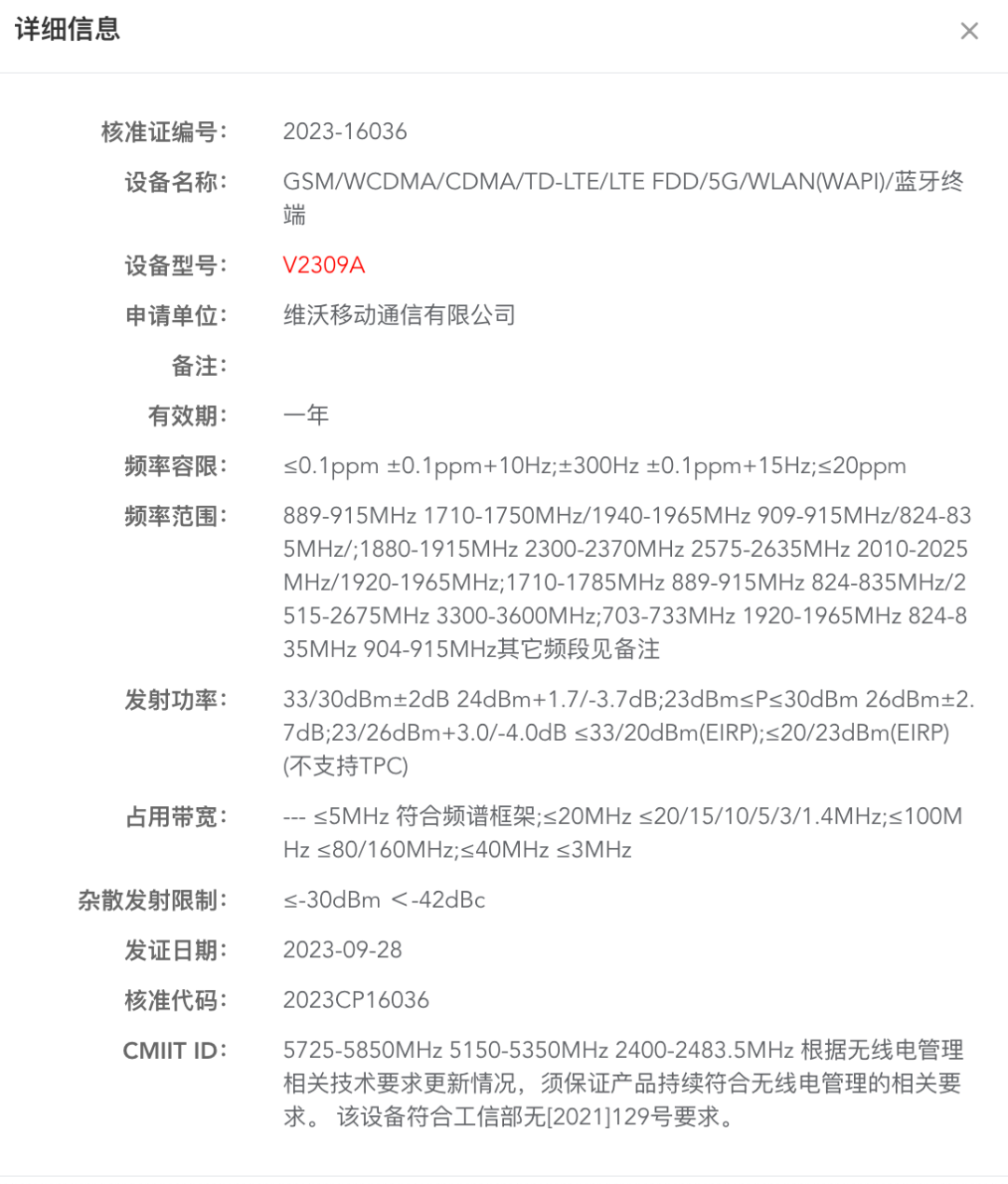 如上图所见,型号为V2309A的vivo新机于9月28日获得入网核准证,有消息称其对应vivo X100 Pro。数码闲聊站爆料称「vivo X100 Pro,或许是迭代大杯里影像最顶的,超级大底主摄、大光圈、全新光学镀膜、暗光潜望镜、超长焦微距等等都安排上了,并且有玻璃后盖版本 」。