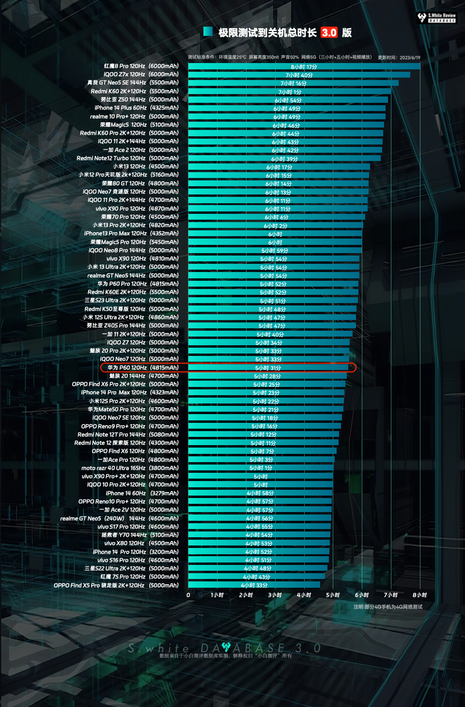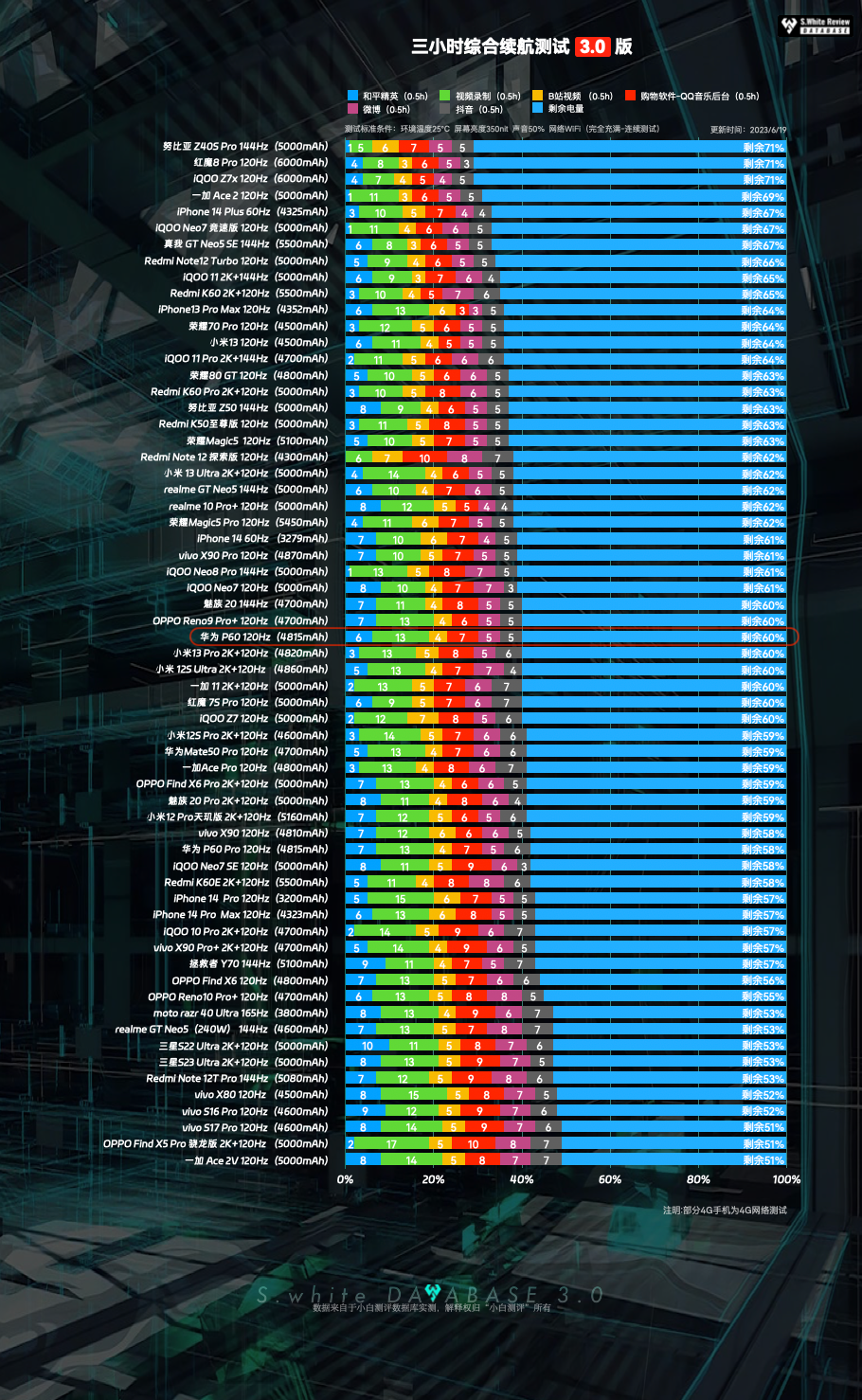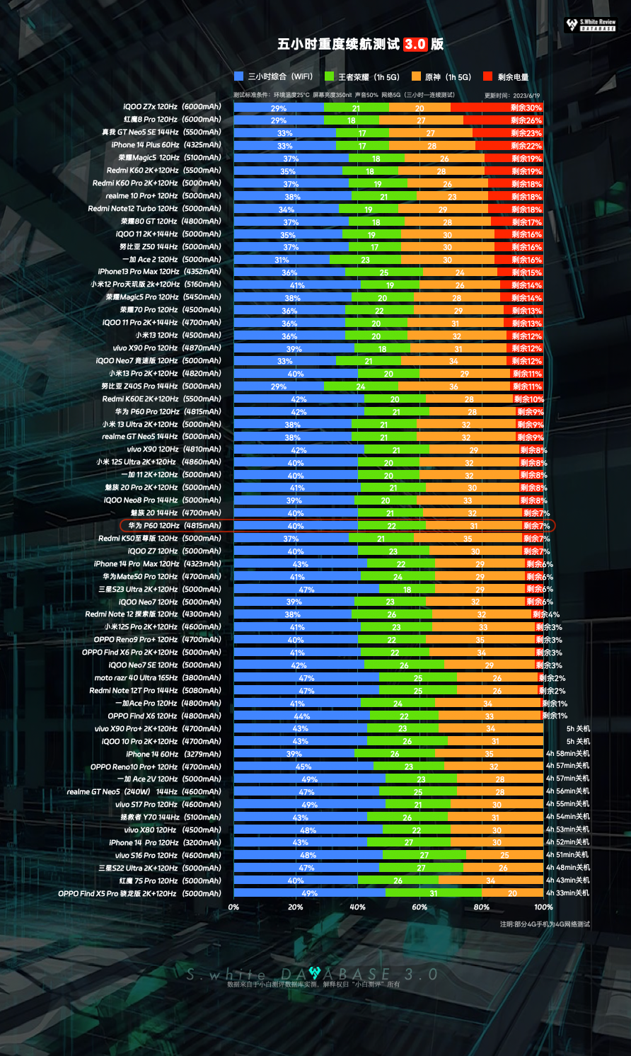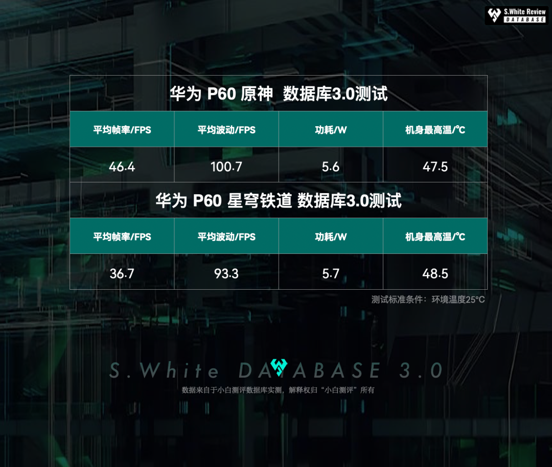 以上基于小白测评数据库3.0模型测试,测试标准条件:环境温25℃±0.5℃,屏幕亮度350nit,声音50%(游戏、5小时重度续航、极限续航测试:性能模式)(数据基于 华为 P60 测试时最新版 HarmonyOS 3.1.0.16系统测试)(*配图榜单仅为6.22小白测评数据库3.0模型下测试数据的陈列展示,不代表机圈所有手机排行)