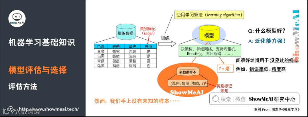 我们手上没有未知的样本,如何可靠地评估?关键是要获得可靠的「测试集数据」(Test Set),即测试集(用于评估)应该与训练集(用于模型学习)「互斥」。