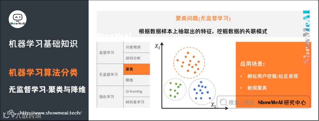 聚类:从海量数据中识别数据的相似性与差异性,并按照最大共同点聚合为多个类别。