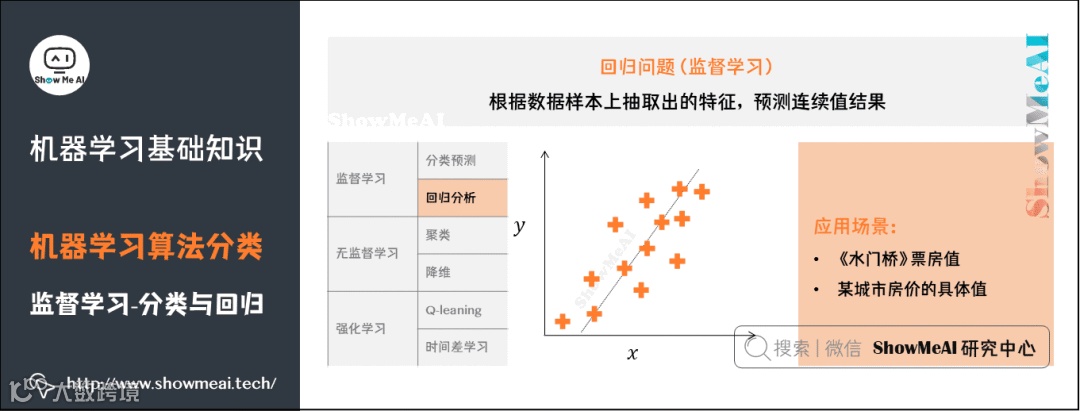 回归:根据对已知属性值数据的训练,为模型寻找最佳拟合参数,基于模型预测新样本的输出值。