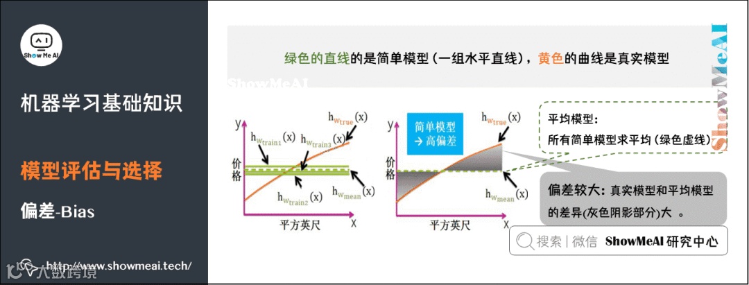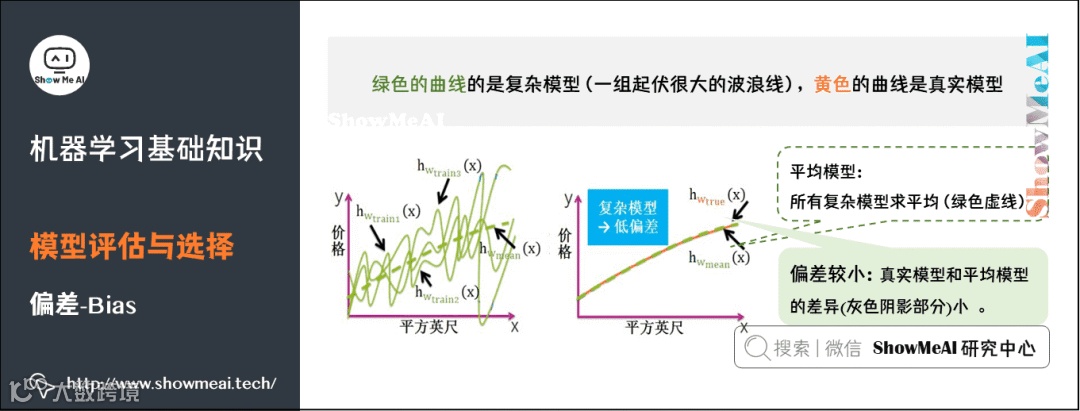 复杂模型是一组起伏很大波浪线,平均之后最大值和最小组都会相互抵消,和真实模型的曲线差别较小,因此复杂模型通常低偏差(见黄色曲线和绿色虚线几乎重合)。
