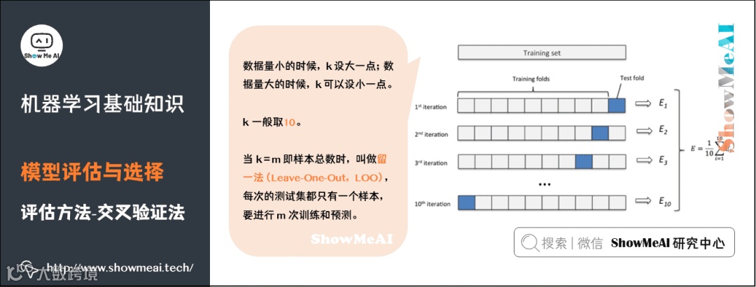 机器学习中,另外一种比较常见的评估方法是交叉验证法(Cross Validation)。k 折交叉验证对 k 个不同分组训练的结果进行平均来减少方差,因此模型的性能对数据的划分就不那么敏感,对数据的使用也会更充分,模型评估结果更加稳定。