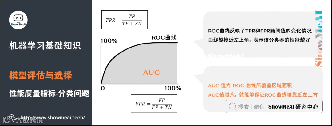 ROC曲线(Receiver Operating Characteristic Curve)全称是「受试者工作特性曲线」。综合考虑了概率预测排序的质量,体现了学习器在不同任务下的「期望泛化性能」的好坏。ROC曲线的纵轴是「真正例率」(TPR),横轴是「假正例率」(FPR)。