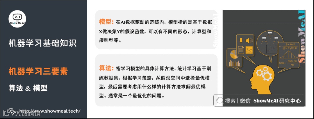 机器学习三要素包括数据、模型、算法。这三要素之间的关系,可以用下面这幅图来表示: