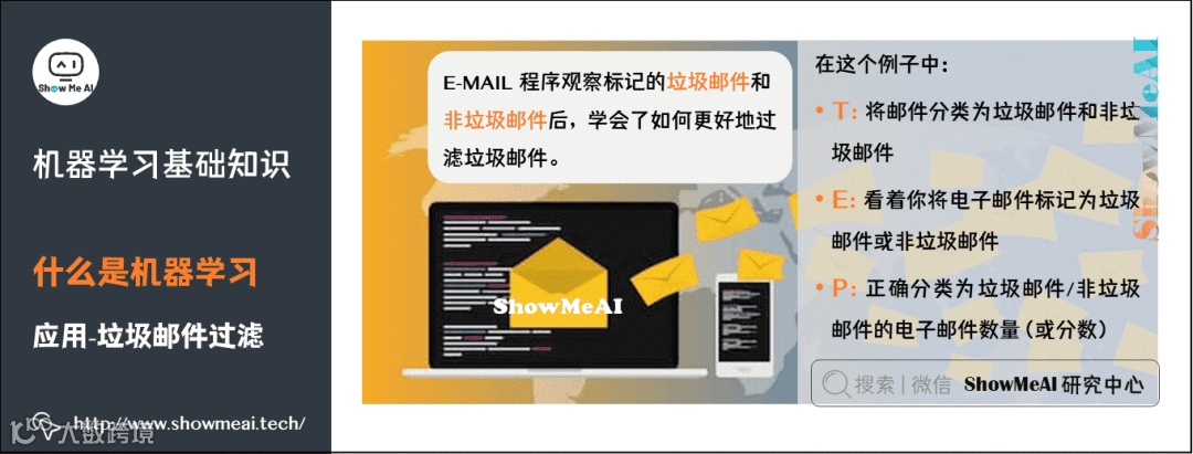 通过经典的 垃圾邮件过滤 应用,我们再来理解下机器学习的原理,以及定义中的T、E、P分别指代什么:
