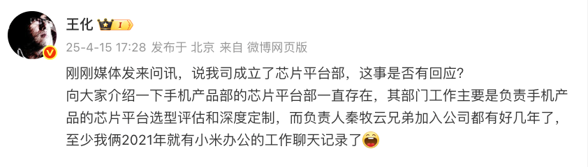如上图所见,小米集团公关部总经理王化表示:手机产品部的芯片平台部一直存在,部门工作主要是负责手机产品的芯片平台选型评估和深度定制,负责人秦牧云加入公司已有好几年,并不是刚成立~