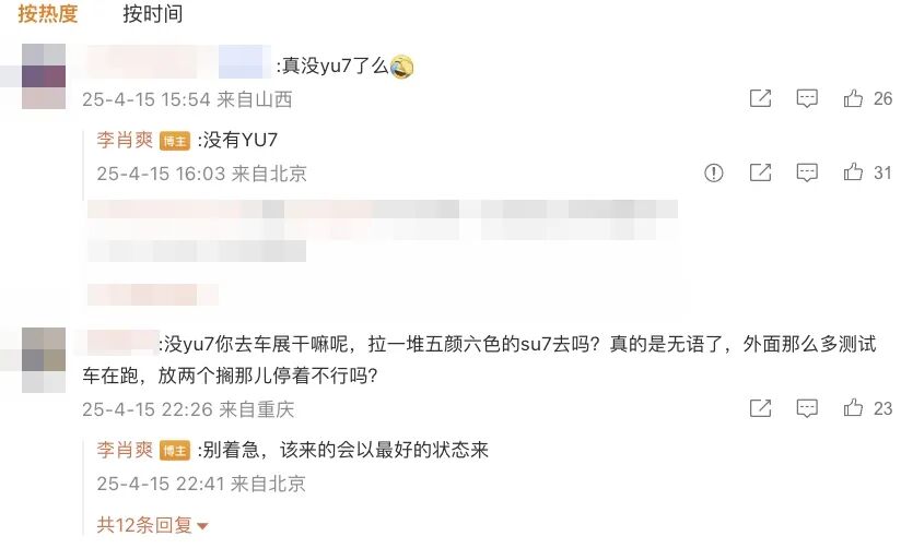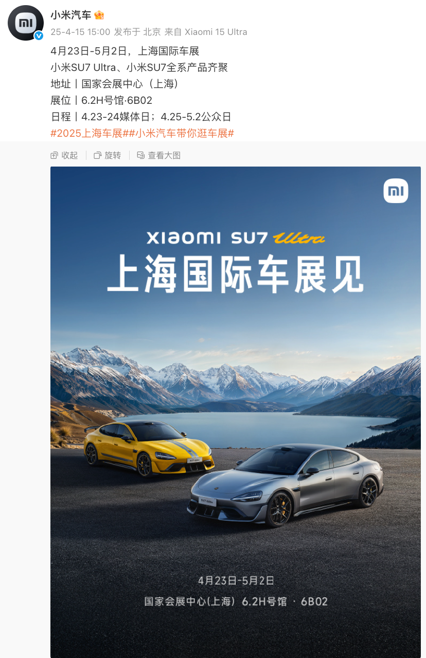 另一边,最近2025上海国际车展即将开幕,小米汽车已确认参展,但最新消息显示本次车展主要带来小米SU7 Ultra、小米SU7全系产品,小米YU7并不会参展。小米汽车副总裁李肖爽表示“该来的会以最好的状态来”。有打算去上海车展的吗?
