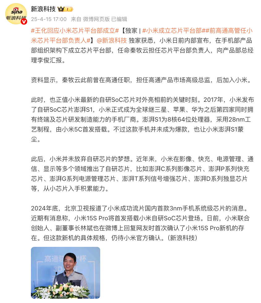 昨日晚间,#小米成立芯片平台部#登上微博热搜,内容为新浪科技独家获悉:小米日前内部宣布,在手机部产品部组织架构下成立芯片平台部,任命秦牧云担任芯片平台部负责人,向产品部总经理李俊汇报。资料显示,秦牧云此前曾在高通任职,担任高通产品市场高级总监,后加入小米。随后小米官方回应,实际有信息差。
