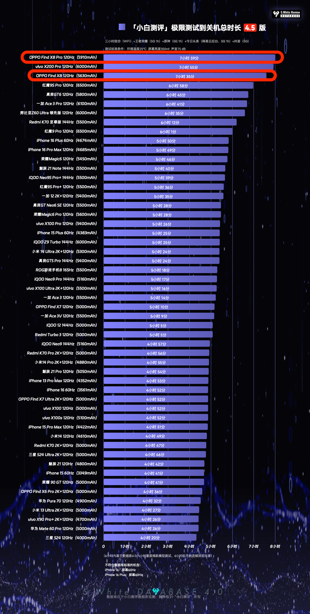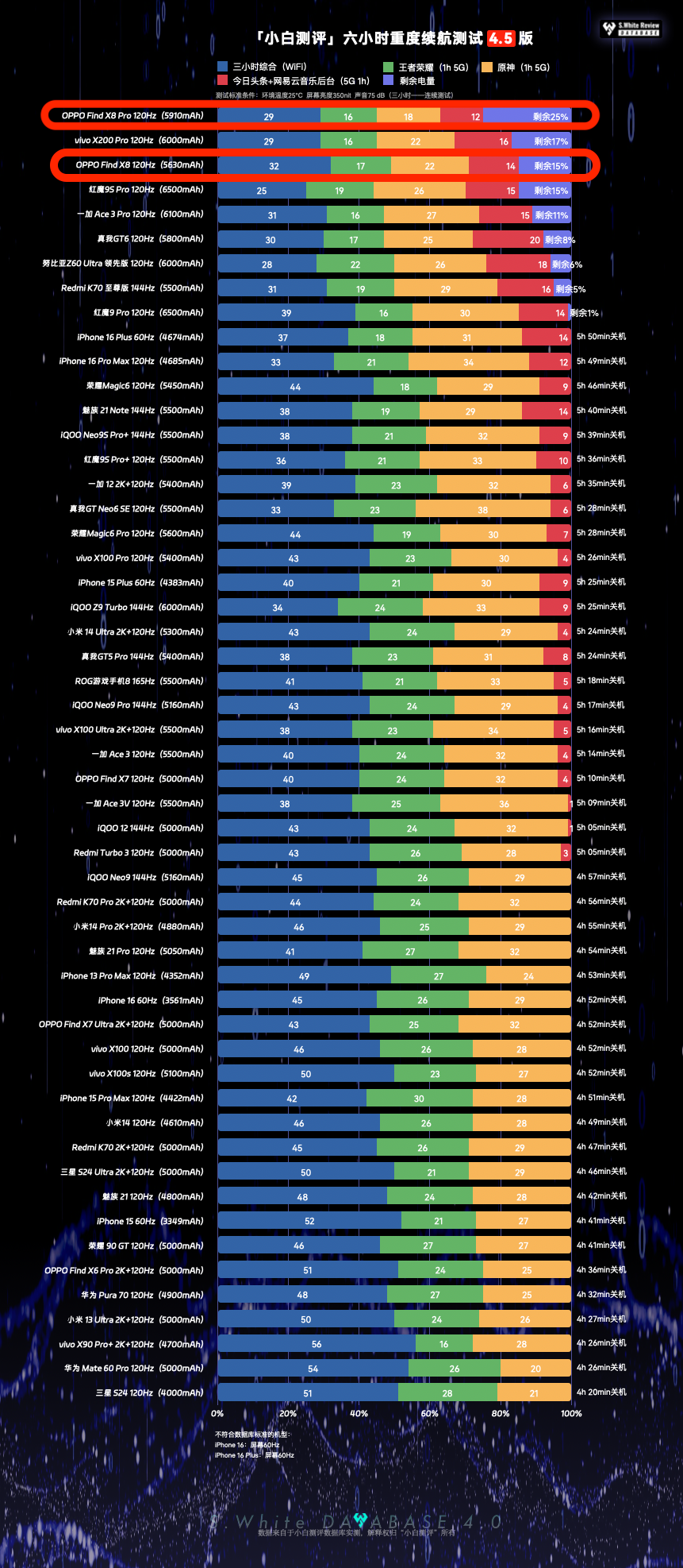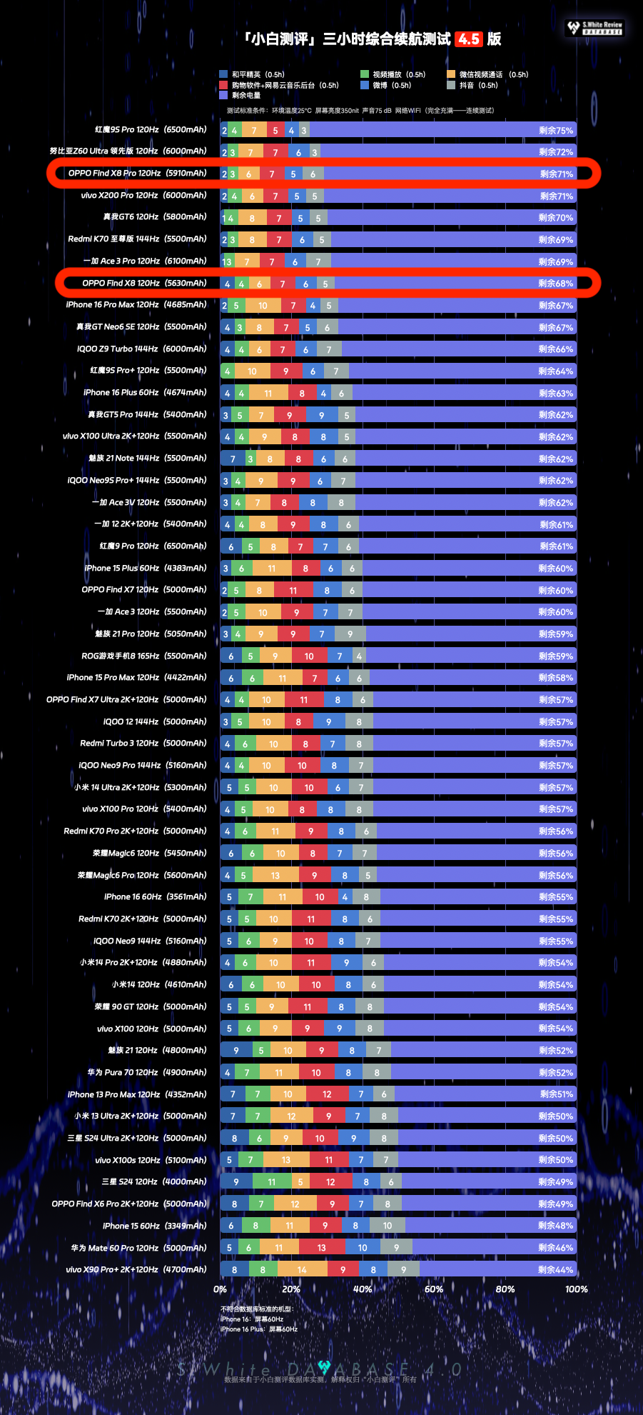 本周发布的Find X8系列续航表现怎么样?现整理小白测评数据库4.5续航模型下的实测结果。