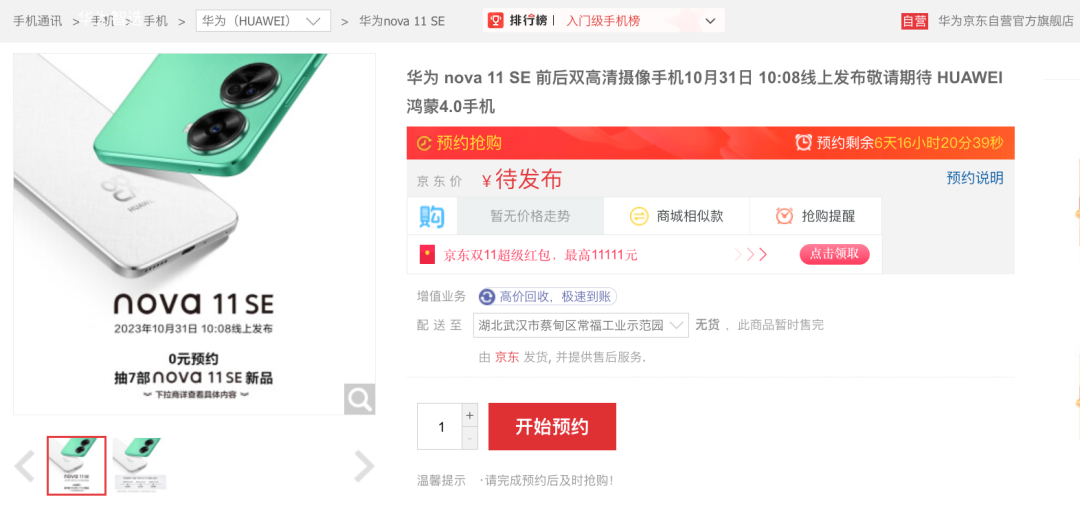 近日华为京东自营官方旗舰店上架了一款名为「华为nova 11 SE」的新机,相关界面显示其目前正在预约中,将于10月31日10:08线上发布,目前外观和配置均有披露。