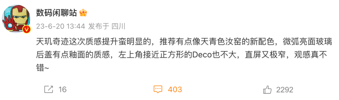 据数码闲聊站暗示,Redmi K60至尊版这次质感提升明显,会有一个类似魅族天色汝窑的新配色,微弧亮面后盖有点釉面的质感,并透露外观方面:正面是一块极窄边框直屏,背部后置相机模组造型则是左上角接近正方形的Deco。