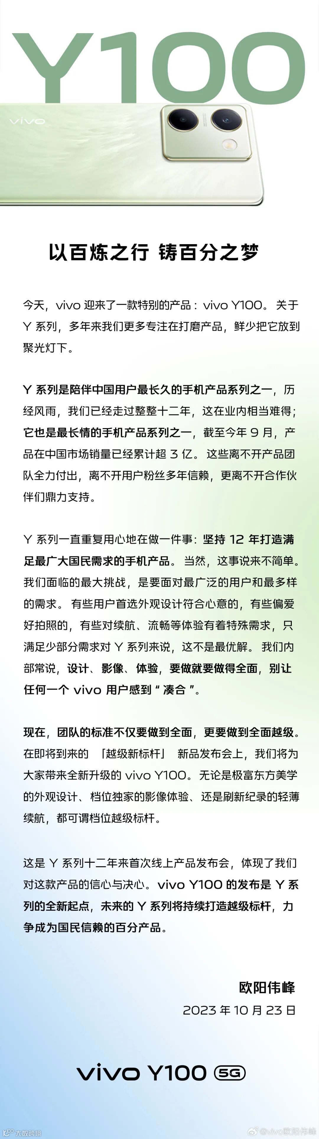 另外vivo产品副总裁欧阳伟峰还在长文中透露:Y系列是陪伴中国用户最长久的手机产品系列之一,截至今年9月,vivo Y系列产品在中国市场销量已经累计超3亿。有用过的吗?