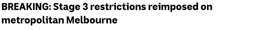 面对暴涨的新增病例数,维州政府今日宣布将对墨尔本大都会区 与 米切尔郡(Mitchell Shire) 进行封锁,即重新恢复第三阶段疫情限制措施。