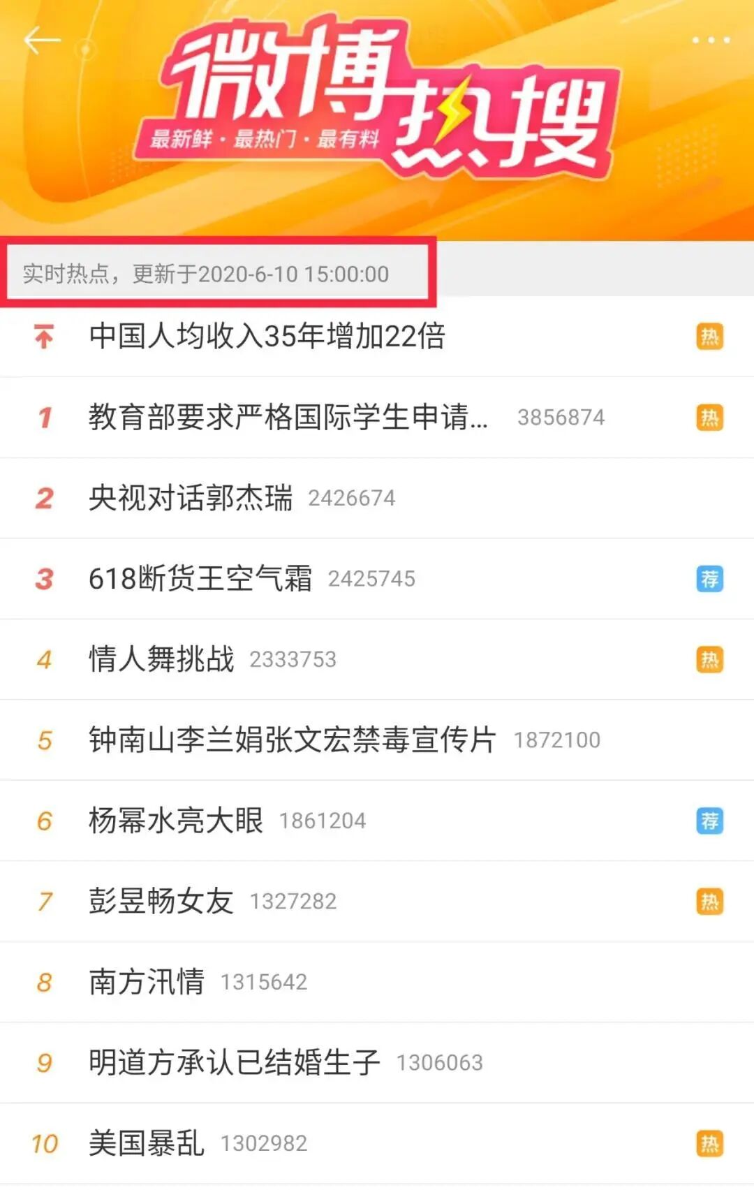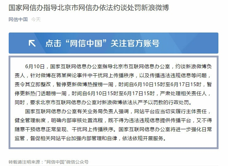 6月10日,国家互联网信息办公室指导北京市互联网信息办公室,约谈新浪微博负责人,针对微博在蒋某舆论事件中干扰网上传播秩序,以及传播违法违规信息等问题,责令其立即整改,暂停更新微博热搜榜一周!