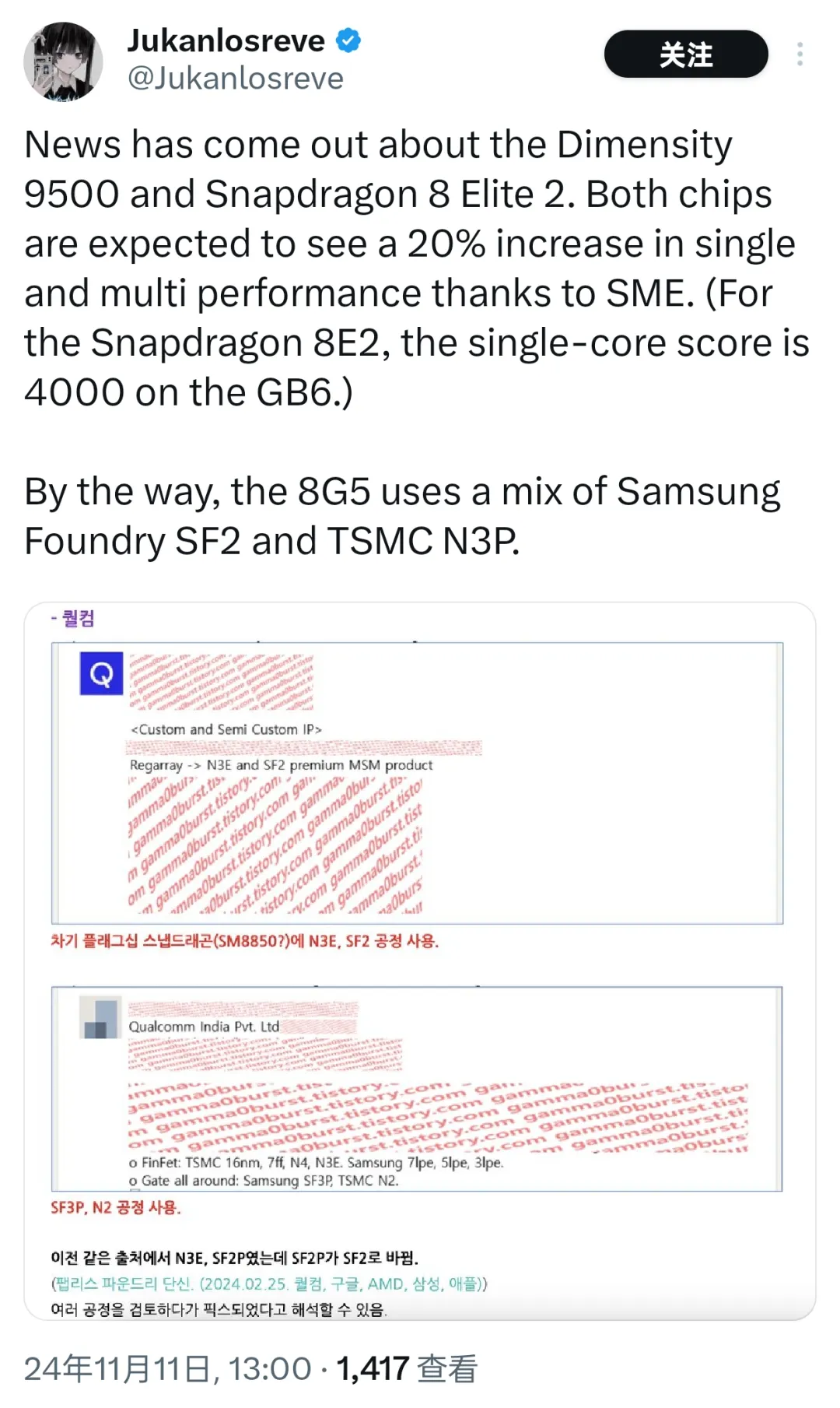 据Jukanlosreve爆料, 骁龙8至尊版2代芯片在GeekBench 6单核成绩突破4000 分,多核性能比初代骁龙8至尊版提升20%,并称该芯片将混合使用三星的SF2代工和台积电的N3P工艺。