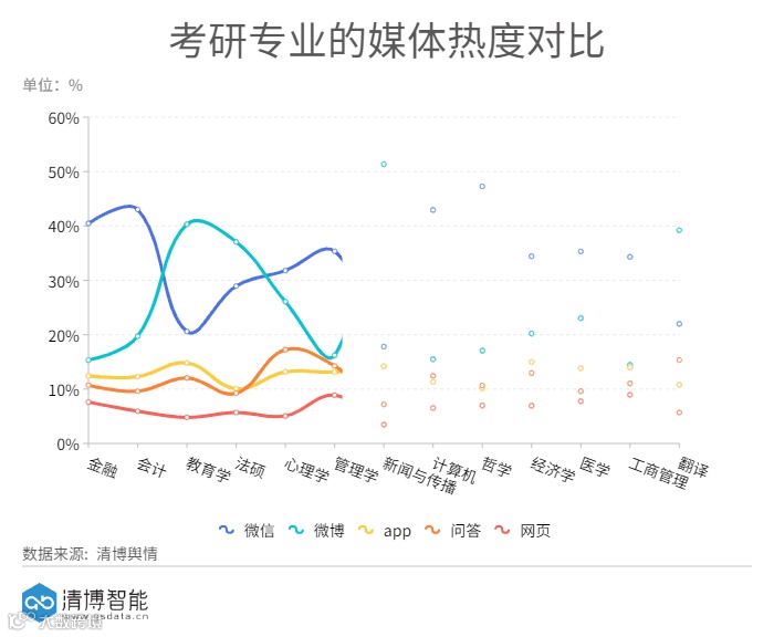 通过对各个专业在各大平台上热度进行统计和对比,我们发现在有关考研的话题上,微信平台的讨论热度是最高的,微博次之。不少考研上岸博主会建立微信公众号来分享考研资料和经验,考研博主也成为了自媒体最容易涨粉的方式之一。