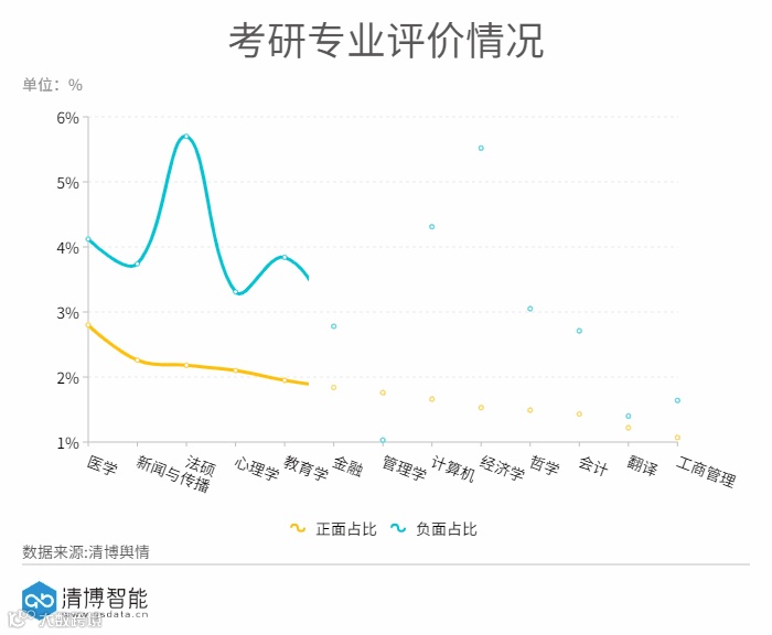 在清博舆情系统中,我们对各个专业的评价情况进行了统计和分析,可以看出,好评最高的是医学专业,其次是新传、法硕和心理学,工商管理专业的好评最低。法硕专业的负面评价最高,并且评价两极分化严重。经济学的负面评价也较高,管理学几乎没有负面评价。