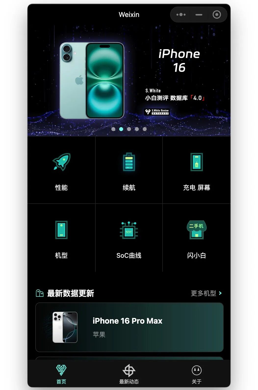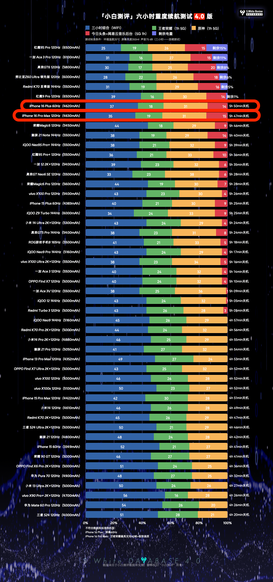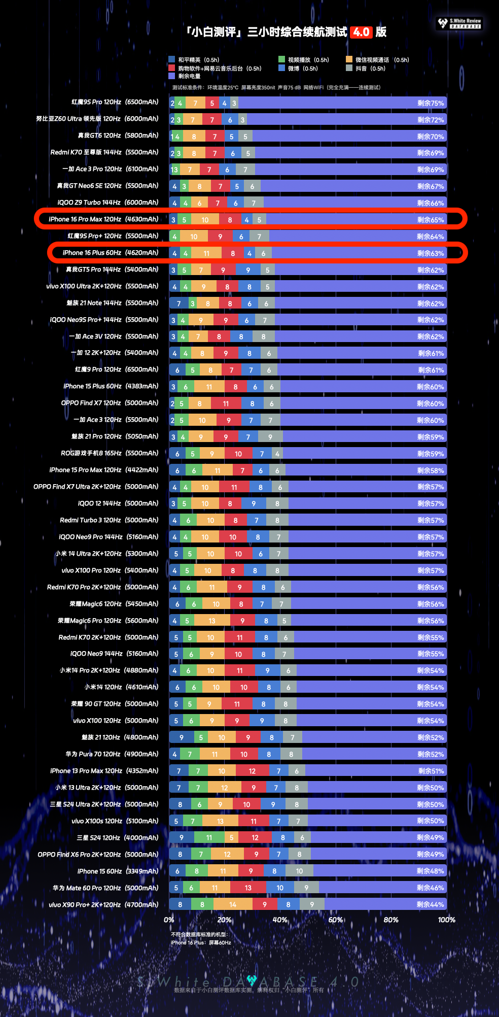 以上续航基于小白测评数据库4.0测试,环境温25℃±0.5℃,屏幕亮度350nit,声音75dB(六小时:性能模式)(数据基于iPhone 16 Plus/Pro Max测试时最新版 iOS 18.0系统测试)更多测试结果可以到小白测评数据库免费查看。