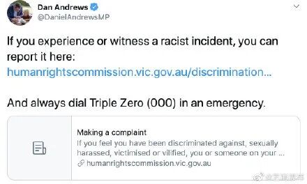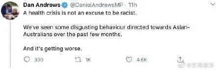 在疫情早期,维州州长Daniel Andrews也发文,反对种族歧视,“健康危机不是种族主义的借口。在过去的几个月中,我们看到了一些针对亚裔澳大利亚人的令人作呕的行为。而且情况越来越糟。”