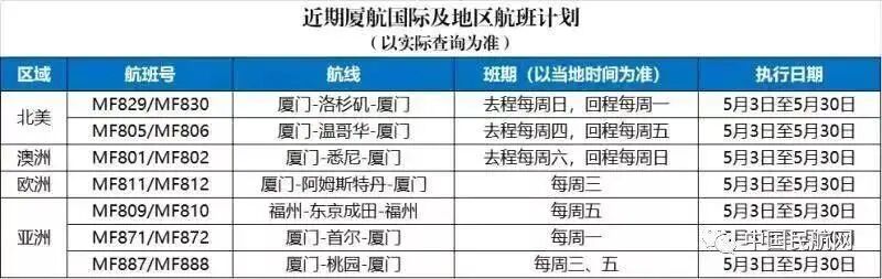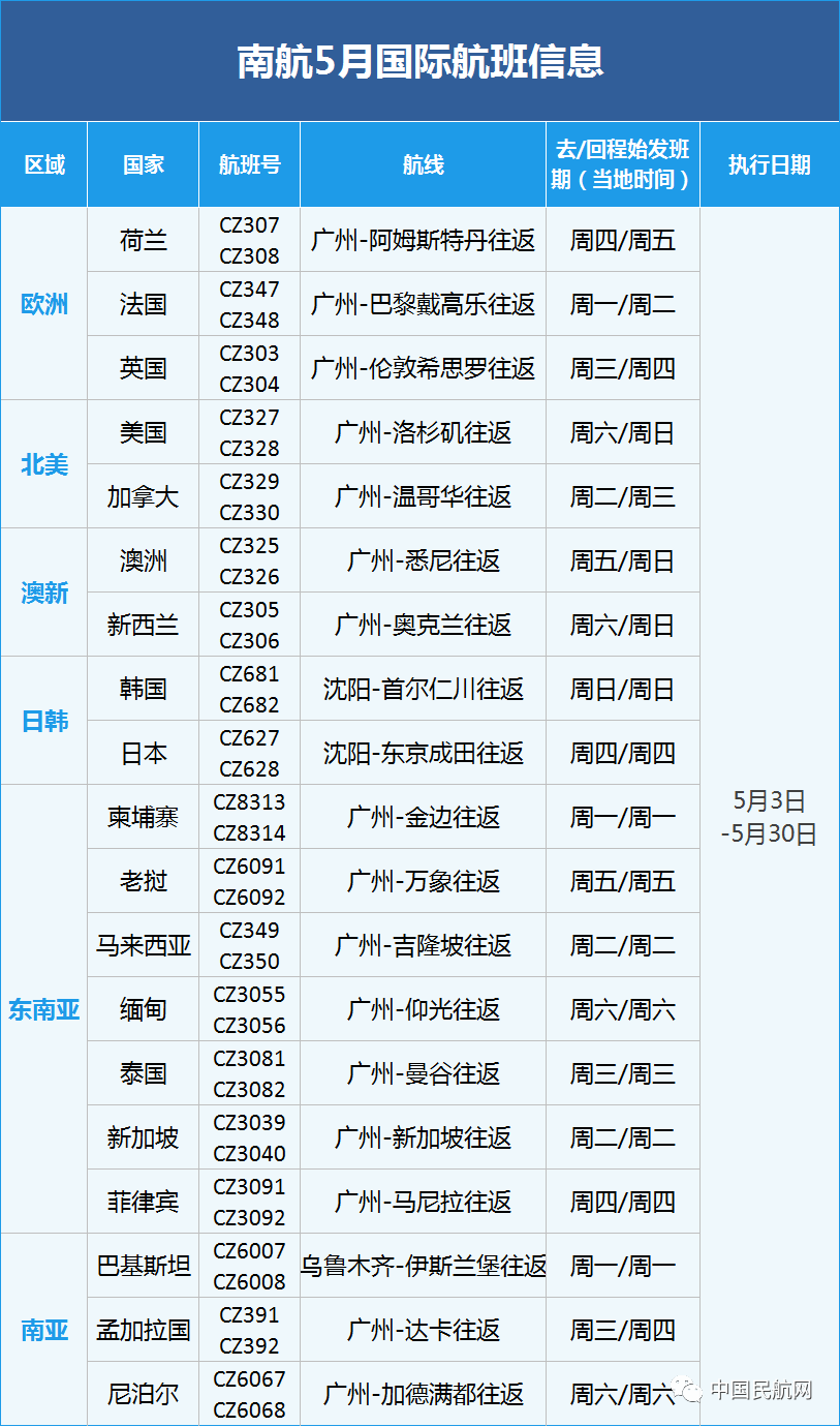南方航空5月3日0时至5月30日24时,南航每周可执行国际航线共计19条,其中涉及广州航线16条,沈阳航线2条,乌鲁木齐航线1条,具体航班计划如下: