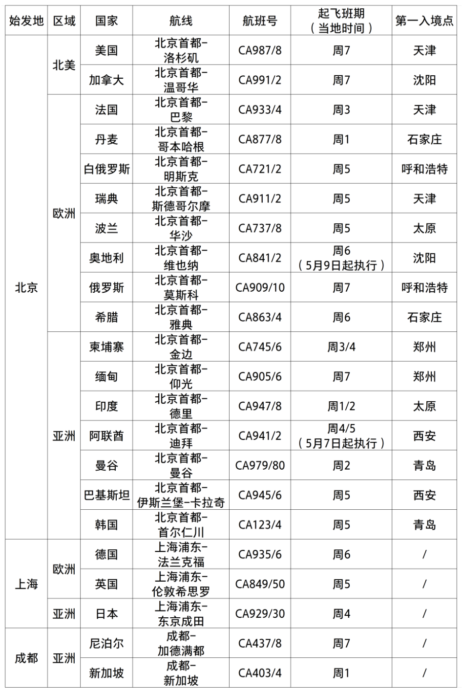 中国国际航空2020年5月1日0时至5月31日24时,北京分流航线17条,浦东相关航线3条,成都相关航线2条,具体航班计划及关于北京地区的第一入境点计划如下:
