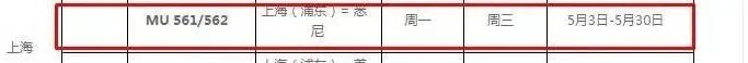 自5月3日0时至5月30日24时,中国东方航空公司每周三执飞悉尼—上海(MU562,由悉尼起飞);