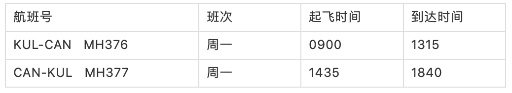 马来西亚航空2020年5月1日0时至5月31日24时,只保留每周一班,广州至吉隆坡往返班次。