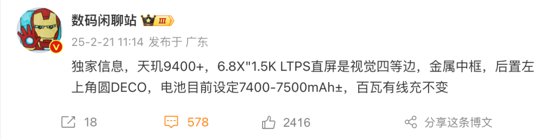 如上图所见,据爆料达人数码闲聊站暗示:REDMI K80至尊版将搭载联发科天玑9400+处理器,采用6.8X英寸左右的1.5K 视觉四等边LTPS直屏,金属中框,后置左上角圆DECO,电池目前设定7400-7500mAh±,同时配备百瓦有线充。