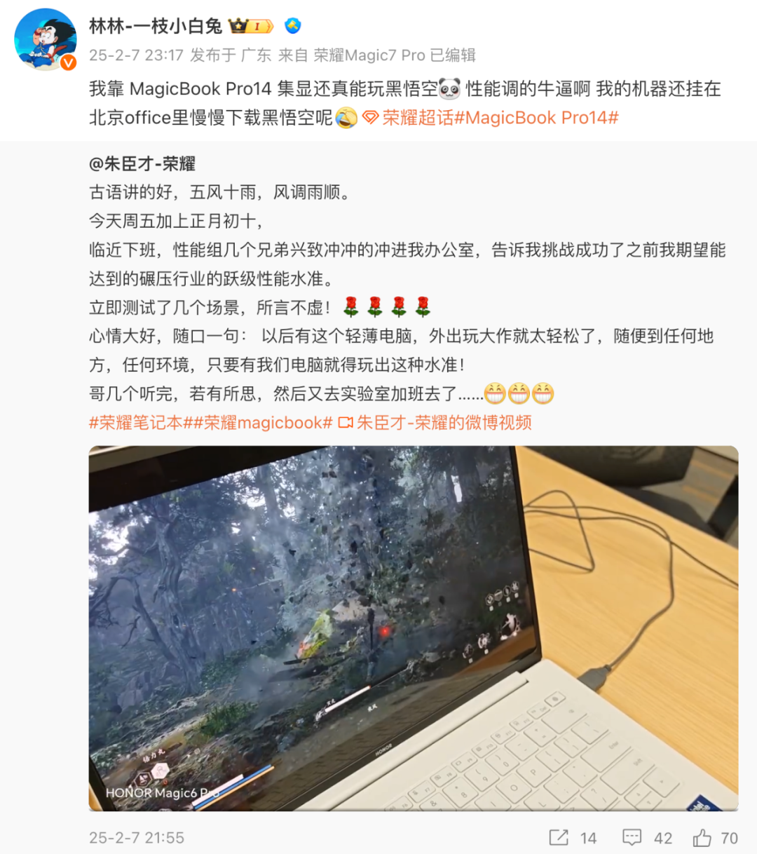 如上图所见,联想前产品经理林林于2024年底加入荣耀,近日在微博在微博转发荣耀同事的一条微博,透露MagicBook Pro14集显真能玩黑神话悟空。