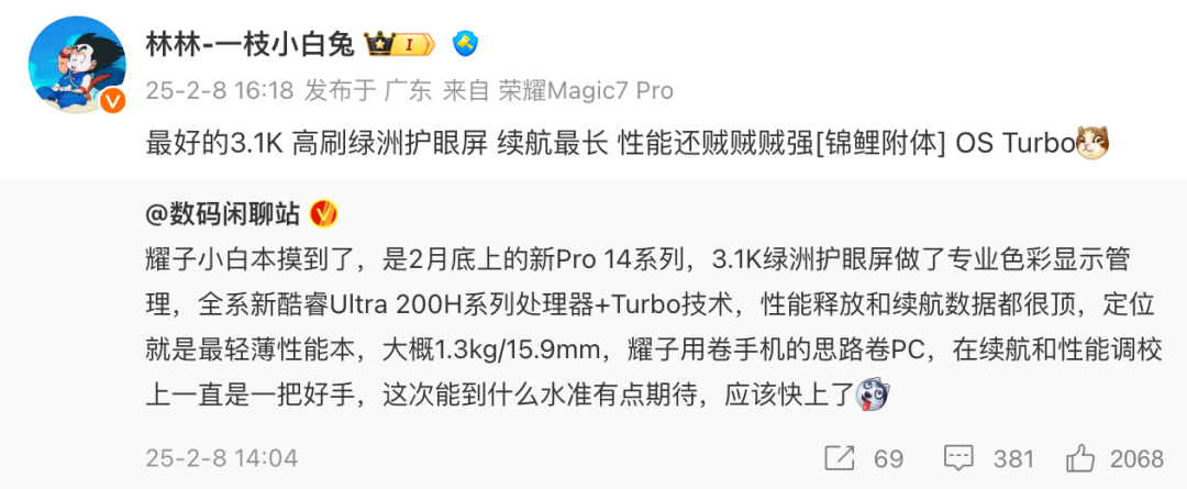昨日爆料博主数码闲聊站还透露:荣耀将在2月底上发布新款MagicBook Pro 14系列,3.1K绿洲护眼屏做了专业色彩显示管理,全系新酷睿Ultra 200H系列处理器+Turbo技术,性能释放和续航数据都很顶,定位是最轻薄性能本,大概1.3kg/15.9mm。荣耀林林还转发称其是最好的3.1K高刷绿洲护眼屏、续航最长、性能还贼强。问问大家,有正在用荣耀笔记本电脑的吗?目前体验如何?