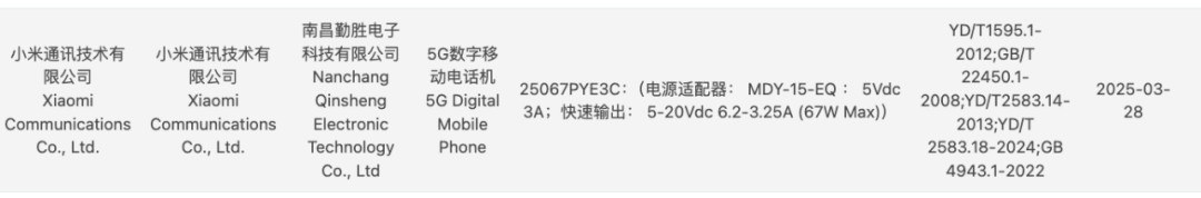 如上图所见,小米Civi5 Pro目前已经获得3C认证,配备67W有线充电。