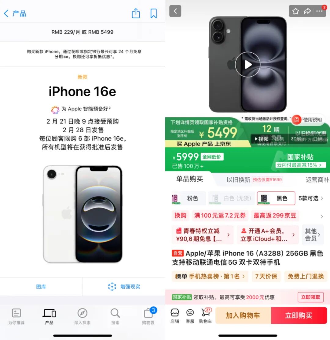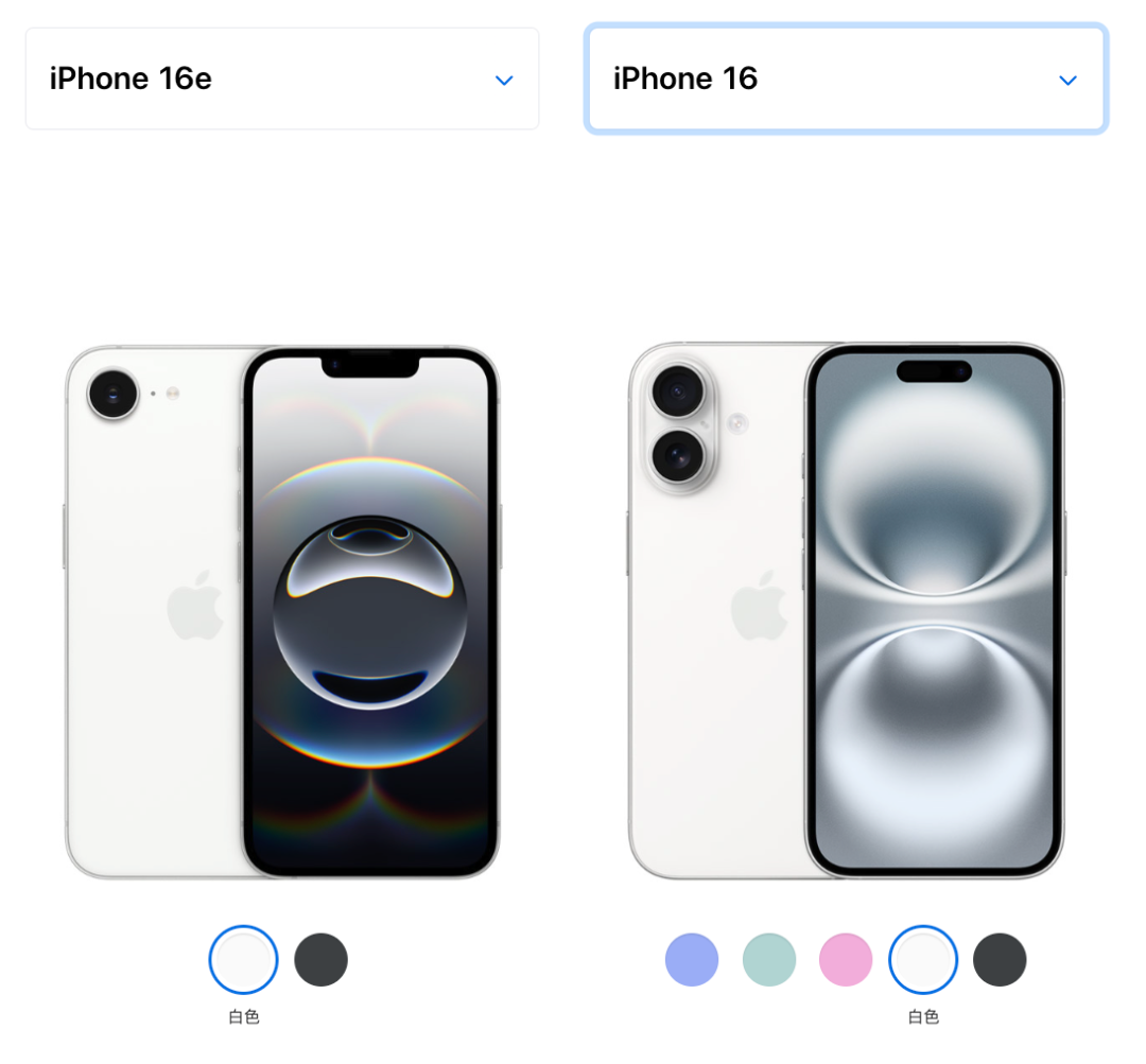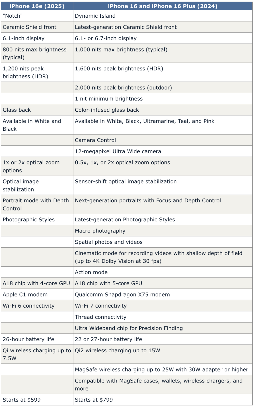 首先是iPhone16e,相比16主要区别在于采用的是刘海屏、没有拍照控制键,搭载A18芯片(6核CPU+4核GPU)、苹果首款自研5G调制解调器C1基带,不支持MagSafe,官网标注视频播放最长可达26小时,后置单摄48MP,不支持拍摄微距/空间照片和空间视频、不支持运动模式。