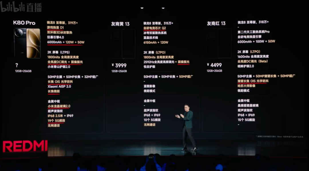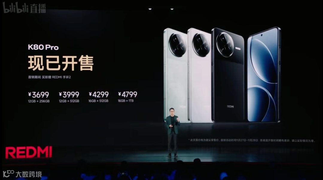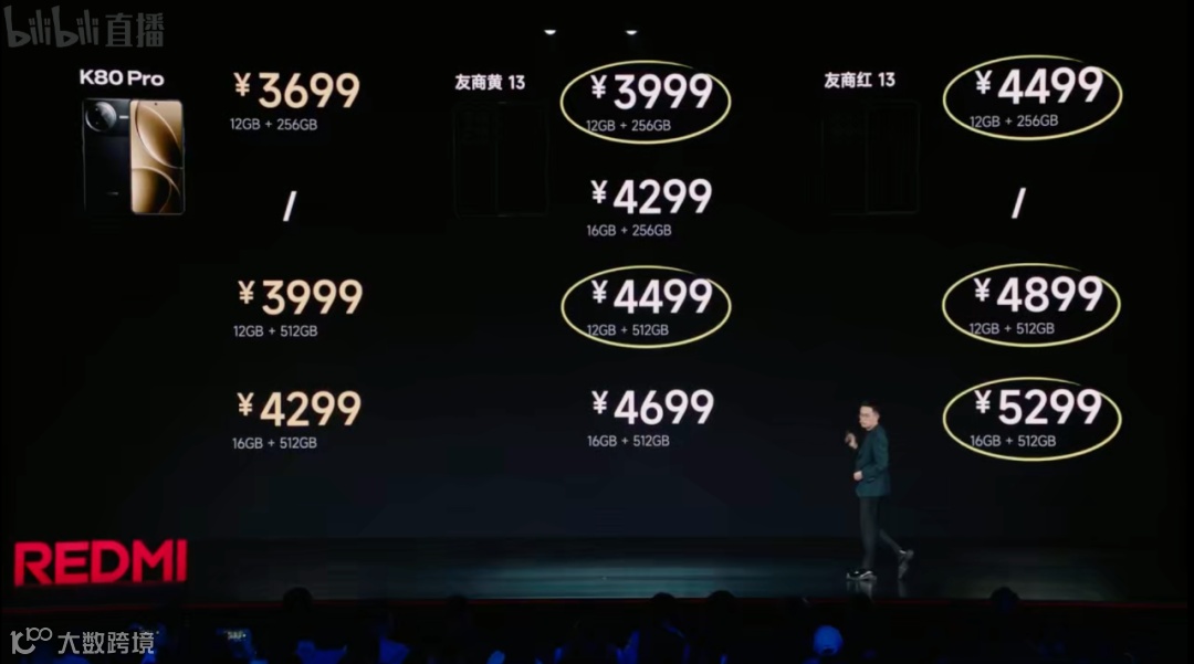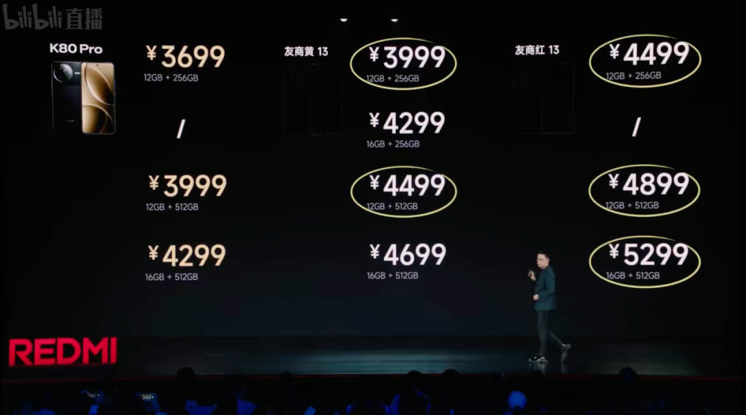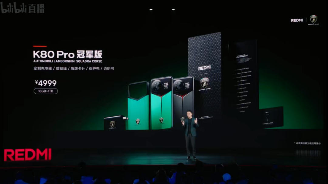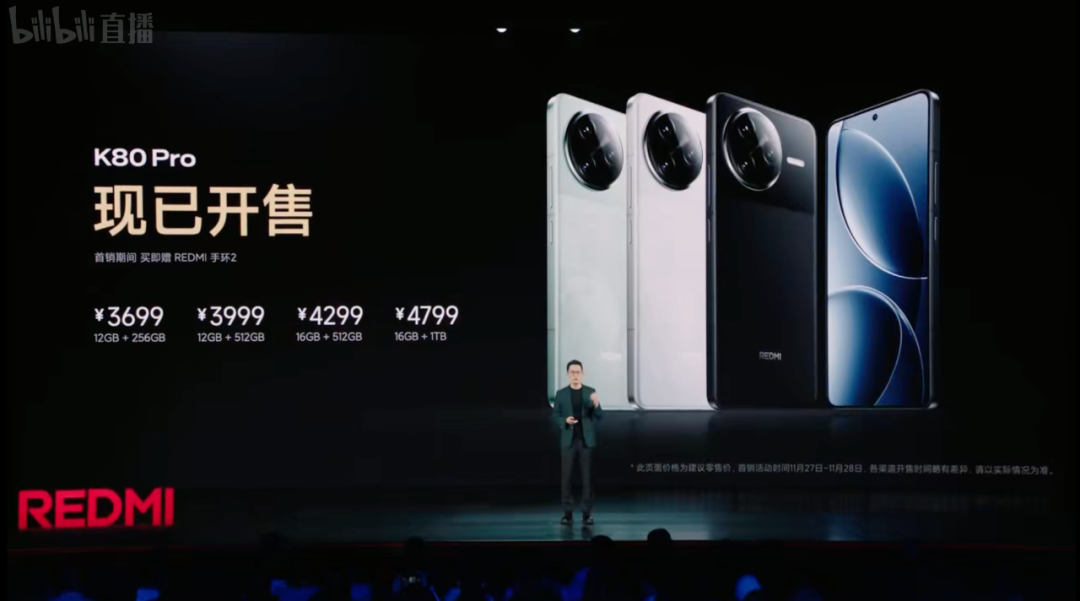 价格上,REDMI K80 Pro:12+256GB版售价3699元,12+512GB版3999元,16+512GB版4299元,16GB+1TB版售价4799元,K80 Pro冠军版16GB+1TB售价4999元。