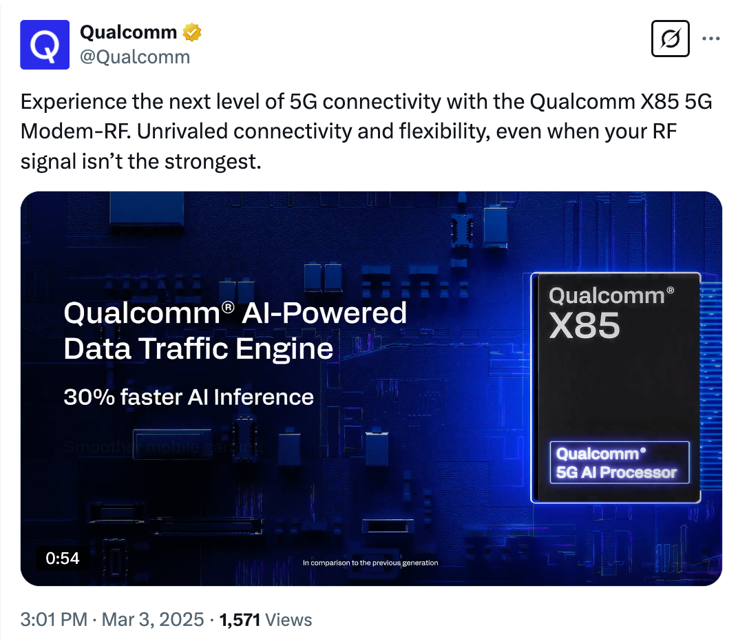 据介绍,Qualcomm X85 5G Modem-RFs是全球首款支持 10Gbps 5G 峰值下载速度的调制解调器及射频系统,X85集成第四代高通5G AI处理器,可提供12.5Gbps的下行峰值速率、3.7Gbps上行峰值速率。中国电信、中国移动、中国联通、谷歌、KDDI、NTT DOCOMO、T-Mobile、Verizon 等全球运营商已公开支持 X85,共同推动5G-A商用部署。
