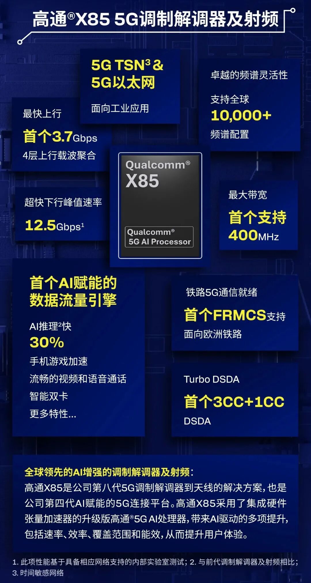 官方还表示X85核心是Qualcomm 5G AI处理器,这是一款集成式AI Tensor加速器,针对5G和5G Advanced用例进行了优化,实现AI推理速度提高30%,进一步增强AI的峰值性能、用户体验、覆盖范围、延迟和功率效率。高通X85还是首个在Sub-6GHz频段中支持400 MHz下行链路(采用1024正交幅度调制)载波聚合的从调制解调器到射频的解决方案,以及在Sub-6GHz频段中首次实现4层上行链路载波聚合等等。