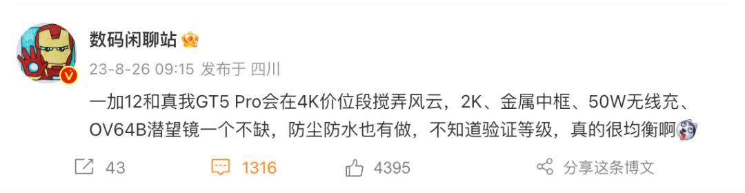 具体爆料称真我GT5 Pro和一加12配置相似,均为2K新基材超高频调光曲面屏、索尼IMX9 1/1.4x" OIS大底新主摄+OV64B 3X潜望长焦方案,老大哥旗舰级算法下放,爆料还称这俩还有金属中框、50W无线充,防尘防水不知道等级但也有做,配置均衡,主打4K价位段。可以预见的是骁龙8 Gen3旗舰们长焦陆续回归,直屏曲屏都有,就目前这些消息来看,你最期待哪家?