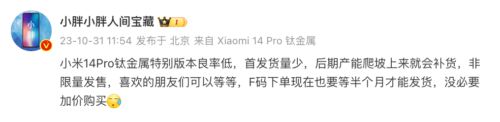 早前小米用户运营经理 @小胖小胖人间宝藏 也曾称:“小米14 Pro钛金属特别版本良率低,首发货量少,后期产能爬坡上来就会补货,非限量发售,喜欢的朋友们可以等等,F码下单现在也要等半个月才能发货,没必要加价购买。”
