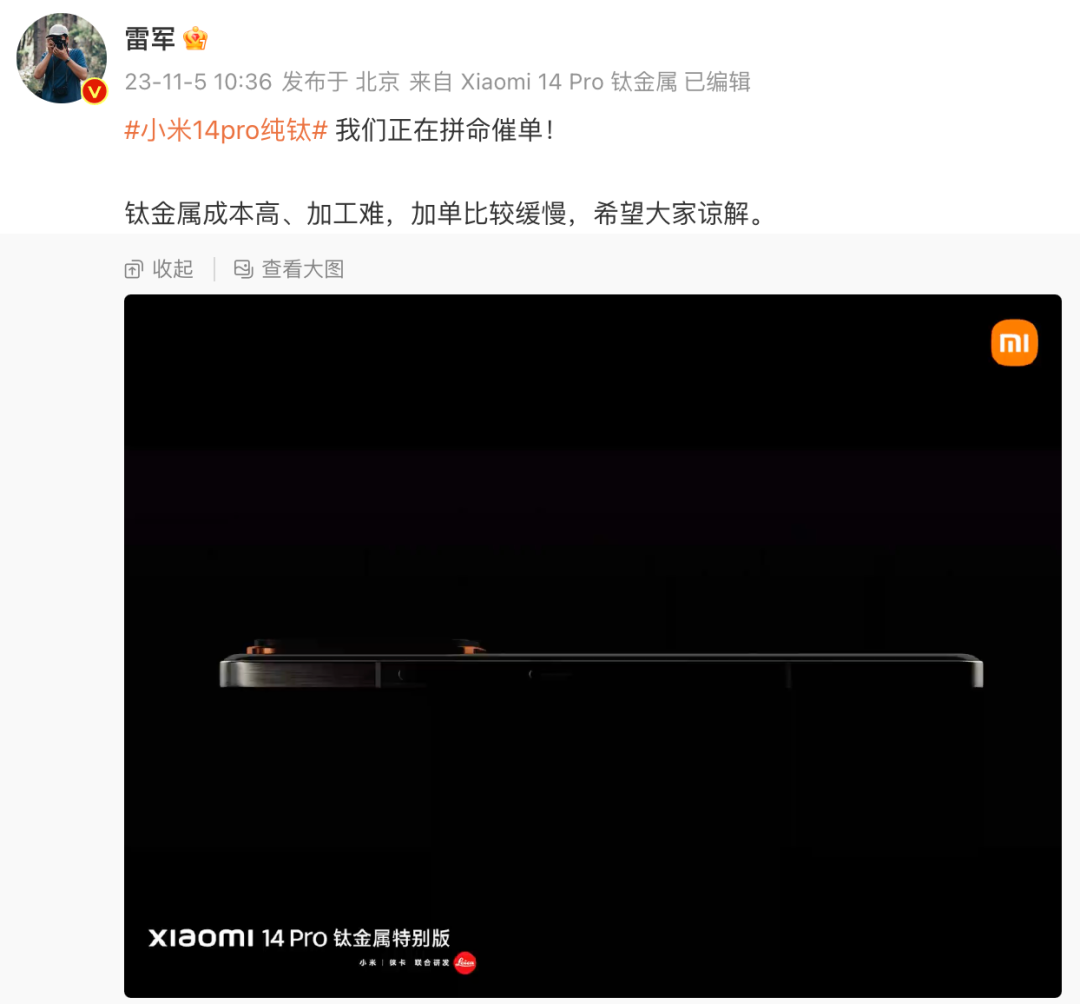 雷军表示“正在拼命催单!钛金属成本高、加工难,加单比较缓慢,希望大家谅解。 ”
