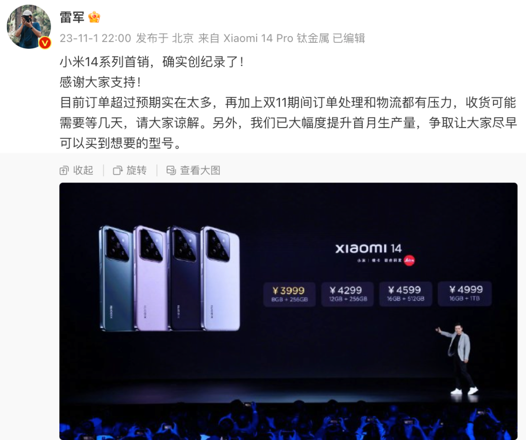 同时表示:「目前订单超过预期实在太多,再加上双11期间订单处理和物流都有压力,收货可能需要等几天,请大家谅解。已大幅度提升首月生产量,争取让大家尽早可以买到想要的型号。」