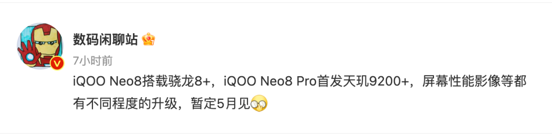 【新机】5月发?iQOONeo8/Pro曝光 分别搭载骁龙8+/天玑9200+