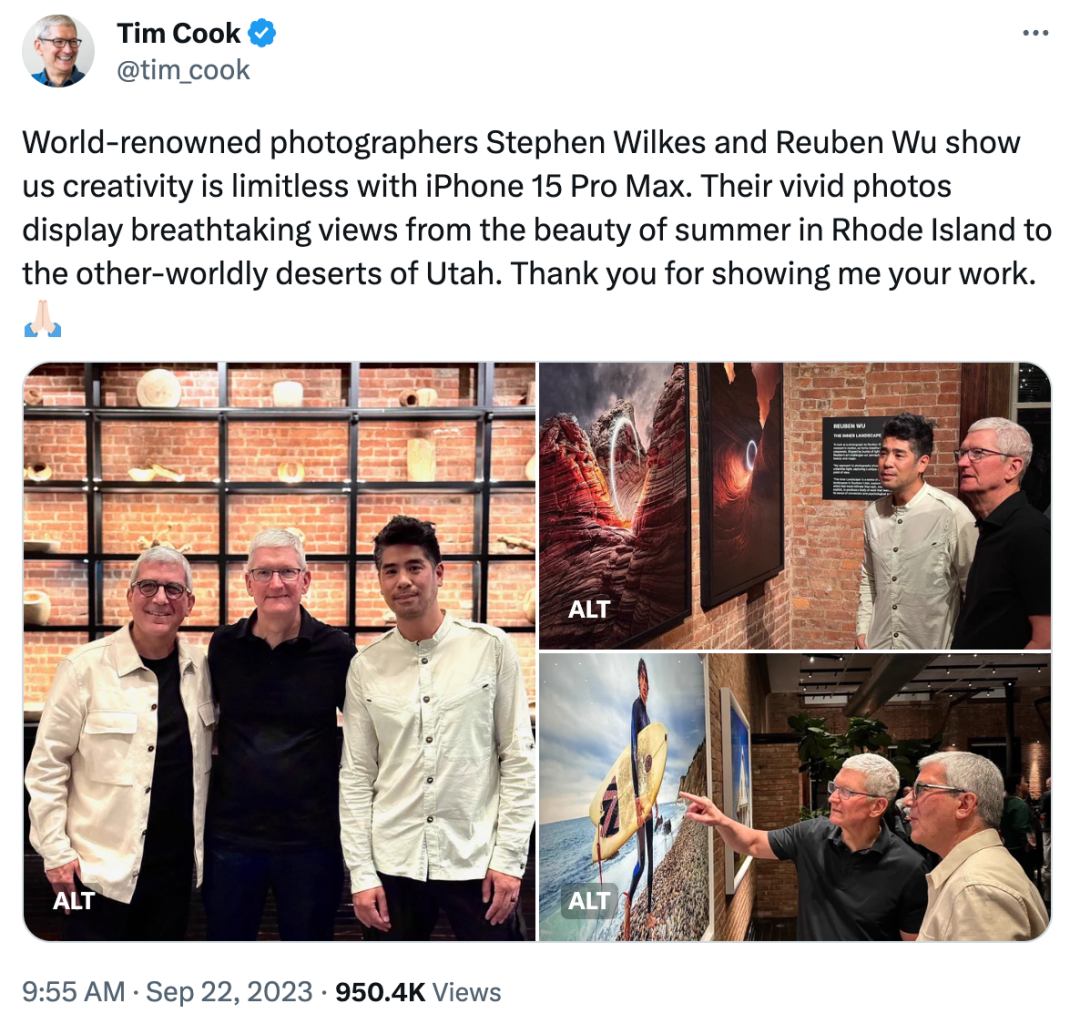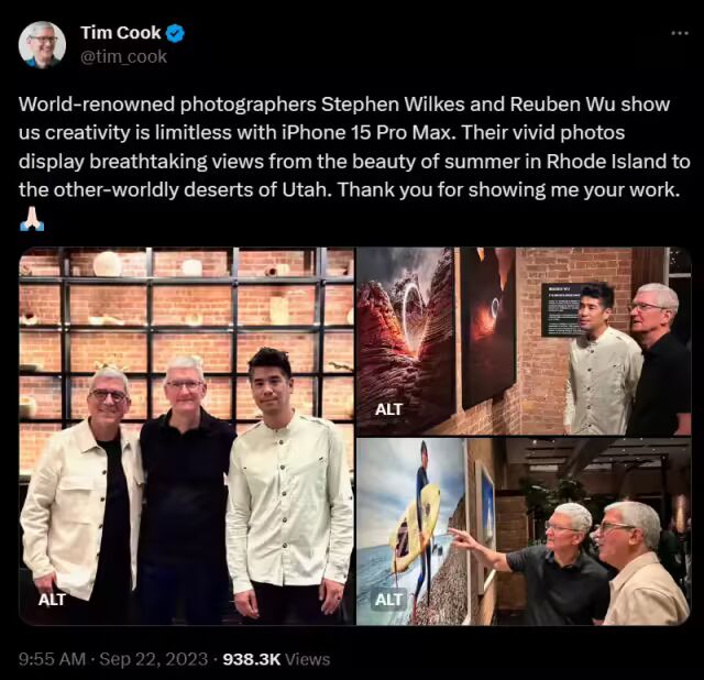 近日,苹果CEO 库克在X平台分享了一组iPhone 15系列的样张,没想到特斯拉CEO马斯克进行了互动并表达了称赞。