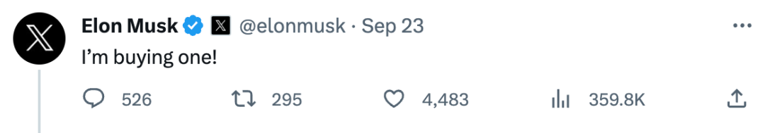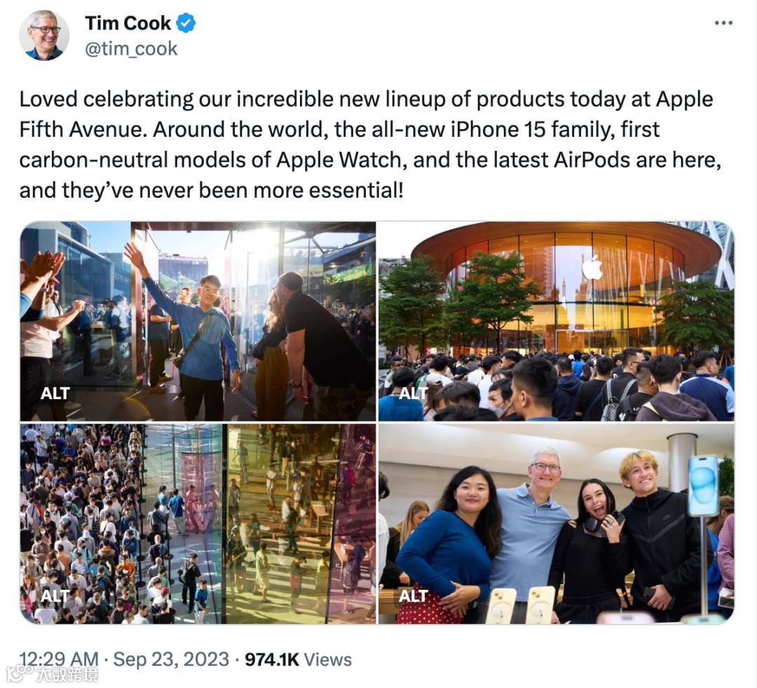随后马斯克还在库克分享iPhone 15系列手机、Apple Watch、AirPods等新品热销时称:“我要买一台!”