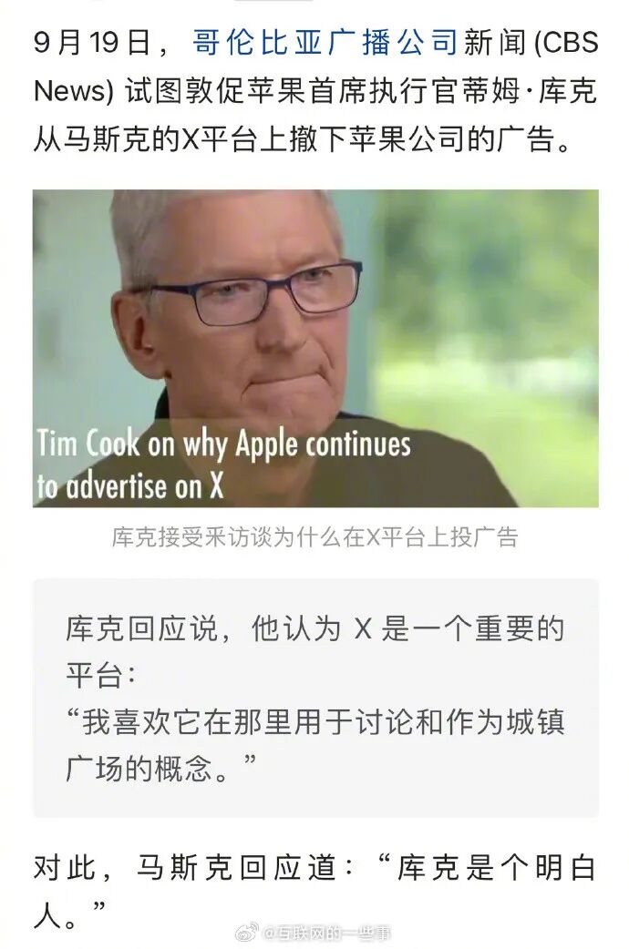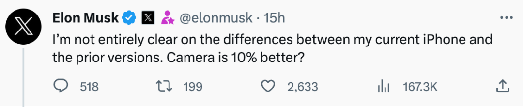 而有意思的是,就在本月初,苹果发布会前几天,马斯克还在一条吐槽iPhone无新意的帖文中称:“我不太清楚我现在的iPhone和之前的版本有什么不同。相机好了10%?”